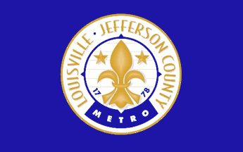 A blue flag, with the seal centered - a large gold fleur-de-lis, two gold stars, the date 1778 in blue, LOUISVILLE JEFFERSON COUNTY in gold, and METRO in white on a blue background all written around the rim.