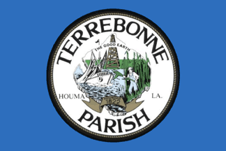 Described as the flag of the Terrebonne Parish Consolidated Government, it is blue with the seal in the center depicting a scene of a fishing boat, an oil derrick and a farmer in the field.