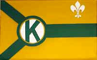 The flag is a yellow field, with a green pall, a green-edged white disk bearing the letter K in green, and in the upper fly a white fleur de lis.
