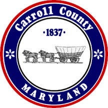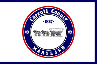 with a band of red forming the outer circle, the second separated from the first by a ring of white and formed by a broad band of blue with the inscription "Carroll County, Maryland" in white inserted between the inner and outer circles on the band of blue which forms the second circle also having two white stylized six-leaved blossoms located, one each, on opposite sides of the same space between the inner and outer circles, and a third and inner circle separated from the second by a ring of white and formed by a ring of black within which is a replica in brown of the four-horse freight wagon with white cover with the year 1837 imposed above the wagon, this year being the time of the creation of