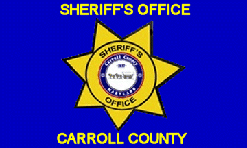 OFFICE" in black letters arching above and below the county seal. The words are repeated in yellow letters above the badge on the blue field, with the words "CARROLL COUNTY" below the badge.