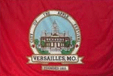 A red flag with the seal centered. The seal bears the image of the city hall, and around written CITY OF THE APPLE FESTIVAL and below VERSAILLES, MO., and the date of founding (1815?)