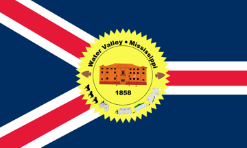 The city of Water Valley has confirmed that it has a flag. Divided per pall, with a red pall, edged white on a dark blue field, and with the city seal centered.