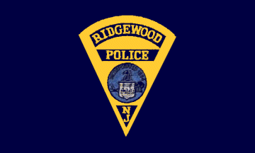 hss-prod.hss.aol.com/hss/storage/patch/fcb3e5de87b83fd17df62399fcac498b). Based on the photographs, the flag of the Ridgewood Police Department features the triangular department logo centered on a dark blue field.