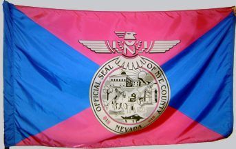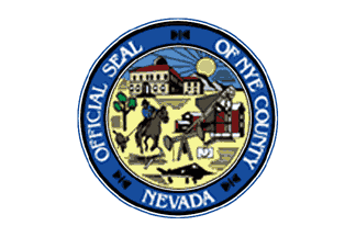 Nye County is the largest county in land area in the State of Nevada. The flag is simply the county seal centered on white. The interior of the seal contains many working parts. Special thanks to Nye County Clerk Sandra Merlino for flag image.