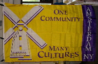 The flag as shown at www.gettysburgflag.com/images/Portfolio/City%20%26%20Town/AmsterdamWindmil2.JPG is yellow with a narrow vertical purple fly stripe. Toward the hoist is a large windmill, and the words One Community Many Cultures. Written downwards on the purple stripe is AMSTERDAM and at the bottom NY.