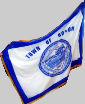 The flag of the Town of Boston, Erie County, New York, is white with the town seal in blue centered and the blue border around. It can be see on a photo here: www.bostonchamberwny.org/Photos.html
