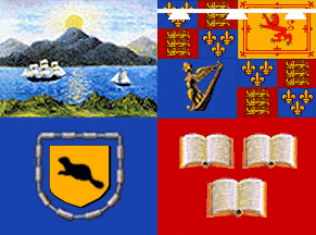 "The flag of the Society displays the shield of the Society and consists of quartered elements, each representative of our origin or purpose." The upper hoist has the arms of the State of New York (representing the society's interest in NY from 1776 on); the upper fly has the arms of James, Duke of York (representing the same from 1664 to 1776); the lower hoist has the arms of the province of New Netherland (ditto, from 1609-1664); and the 3 open books in the lower fly represent the library and literary pursuits of the society.submitted by: Ned Smith, 14 June 2001
