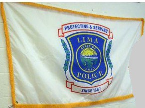 White flag, blue rim, red-edged blue and white shield in center. LIMA, OHIO written above in red.