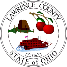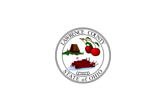 The flag seems to be a simple white cloth with the county's seal in it, probably centered. The seal contains the words "LAWRENCE COUNTY / STATE of OHIO" in the outer ring and four elements in the central area: a branch with a couple