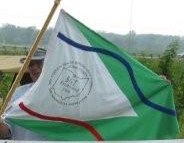 The flag with green with a white hoist triangle bearing the township logo in black and overall two thin wavy stripes — red along the bottom and blue along the top of the flag.
