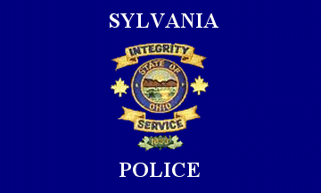 The flag of the Sylvania Police Department is royal blue with the department seal in the center. Above the seal in white letters is the word "SYLVANIA", and below the seal in white letters "POLICE".