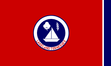 This is a very dark blue (Old Glory blue) disc with a wide white ring, itself bordered by a narrow edge of the same shade of blue. Centered on the bottom part of the ring, the lettering "Lakeland Tennessee" set in narrow sans-serif dark red capitals. On the disc, a stylized two-sail ship below a twig of fir (?) dexter, and a cotton "flower" sinister.