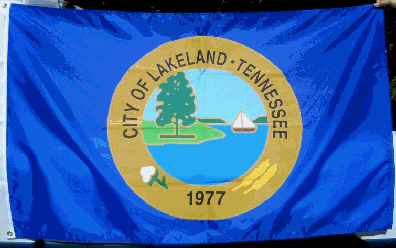 A Tennessee design with the city logo in the center. In 1985 a Lakeland city flag designed by Cindy Towsend McCord was chosen from designs submitted in a city-wide contest. It was dedicated at the Homecoming '86 function on June 15, 1986.