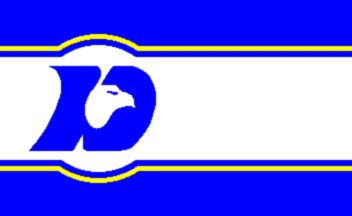 Horizontally banded blue-white-blue, the white stripe wider, and each blue stripe with a narrow yellow stripe toward the center stripe. Near the hoist, the stripes bulge apart, and a large blue written letter D has a white eagle head in the center.