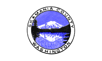 The flag of Skamania County: white with a seal on it. This seal shows a mountain and lake shore landscape and rim reading "Skamania County", "Washington"