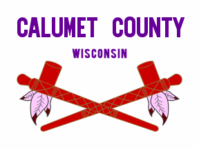 The flag of the Calumet County, Wisconsin, is white with two crossed pipes of peace in red, and :CALUMET COUNTY / WISCONSIN" in lilac above. Photo of the flag thanks to Beth A. Hauser, County Clerk.