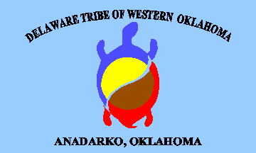 The Western Delaware use a light blue flag. "DELAWARE TRIBE OF WESTERN OKLAHOMA" forms an arch of black letters across the top of the flag. Across the bottom, again in black letters, is "ANADARKO, OKLAHOMA", the Delaware's capital, home to the Area Office of all Western Oklahoma Tribes and the American Indian Hall of Fame.