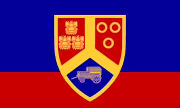 "A rectangular flag per fess abaisse Azure and Gules with the armorial shield of