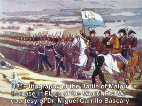 There is a 1819 lithography of the Battle of Maipú where General San Martín appears holding the Andes Army flag. There, clearly the flag has two horizontal stripes. However the coat of arms instead of being centered, appears next to the hoist in a similar way to the Spanish 1785 War Ensign. The lithography is almost contemporary to the battle and of documental importance since it was made under the supervision San Martín Aide de Camps; Mayor Alvarez Condarco, who participated in the battle. Therefore this lithograph has a documental and historical importance to History and Vexillology. [see image]
