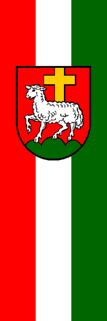 | Description of arms (German): | In Rot auf grünem Dreiberg ein silbernes Lamm mit einem goldenen, auf dem Rücken aufgesteckten, lateinischen Kreuz. |