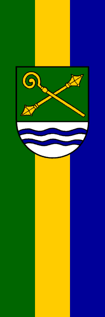 | Description of arms (German): | Erniedrigt geteilt; oben in Grün schräggekreuzt ein goldener Krummstab und ein goldener Streitkolben mit zwei Köpfen, unten in Silber zwei blaue Wellenleisten. |