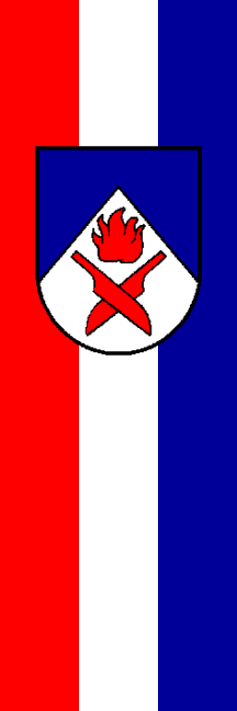 | Description of arms (German): | In Blau eine silberne, erhöhte Spitze, darin über zwei roten, gestürzten und schräggekreuzten Pflugscharen eine rote Flamme. |
