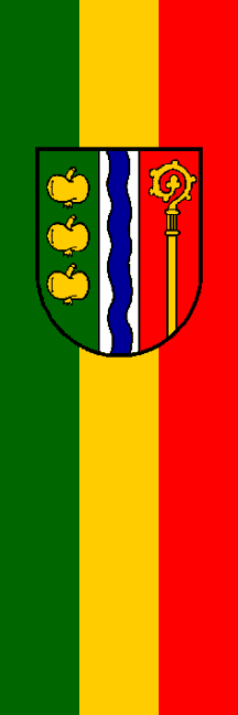 | Description of arms (German): | Von Grün und Rot durch einen silbernen, mit einem blauen Wellenpfahl belegten Pfahl gespalten; rechts pfahlweise drei goldene Äpfel, links ein goldener, vom Unterrand des Schildes ausgehender Bischofsstab. |