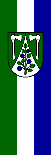 | Description of arms (German): | In Grün eine silberne, eingebogene Spitze, darin ein aufrechter Heidelbeerzweig mit grünen Blättern und blauen Früchten, rechts und links je eine silberne, einwärts gestellte Axt. |