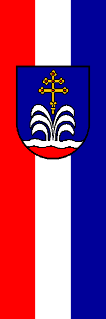 | Description of arms (German): | In Blau über rotem Schildfuß eine aus silberner Wellenleiste aufsteigende, silberne Fontäne; darüber ein goldenes, mit roten Steinen geschmücktes doppelarmiges Steckkreuz mit Kleeblattenden. |