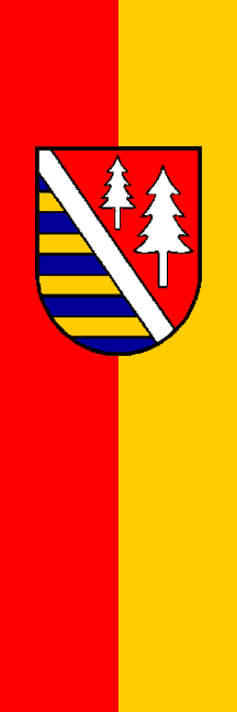 | Description of arms (German): | Durch eine silberne Schrägleiste geteilt; oben in Rot zwei silberne wurzellose Nadelbäume, der rechte kleiner als der links, unten von Blau und Gold neunmal geteilt. |