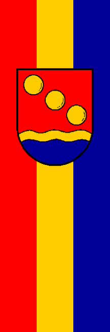 | Description of arms (German): | Von Rot und Blau durch eine goldene Wellenleiste erniedrigt geteilt; oben schräg hintereinander drei goldene Ballen. |