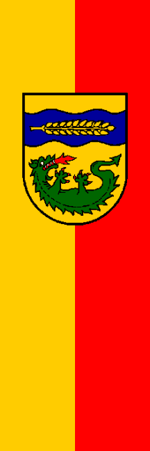 | Description of arms (German): | In Gold unter einem erhöhten, blauen Wellenbalken, darin eine goldene, liegende Weizenähre, ein grüner, am Rücken liegender, aufwärts gebogener, feuerspeiender Lindwurm mit roten Krallen. |