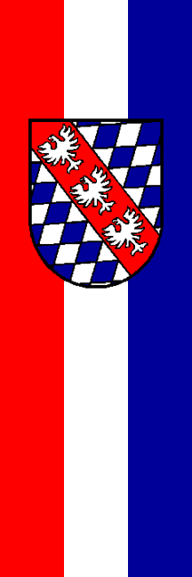 | Description of arms (German): | Von Silber und Blau schräglinks gerautet; belegt mit einem roten Schrägbalken mit drei silbernen, an den Fängen gestümmelten Adlern. |
