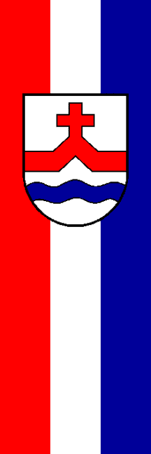 | Description of arms (German): | In Silber über einer blauen Wellenleiste ein aus zwei roten Balkenstücken sich erhebender, mit einem roten Kreuz besteckter roter Sparren. |