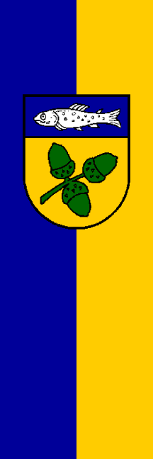| Description of arms (German): | Unter blauem Schildhaupt, darin eine silberne Bachforelle, in Gold ein grüner, schräglinkshin gestellter, blätterloser Zweig mit drei Eicheln. |