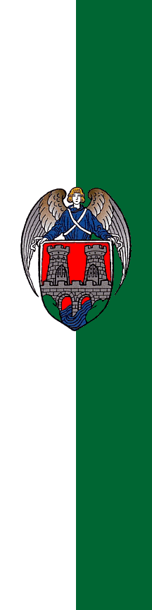 | Blazoning of arms (English): | Gules, in base between two mounts Vert a water stream, from mount to mount a bridge Argent masoned and embattled with a pillar in the centre of the water stream and two round towers Argent embattled, with open gates and loopholes. |