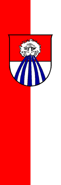 | Description of arms (German): | Rot über Silber geteilt, darin oben ein vorwärtsgekehrter silberner (weißmarmorner) wasserspeiender Löwenkopf, der Schwall ergießt sich in fünf blauen Strahlen in das untere Schildfeld. [1] |