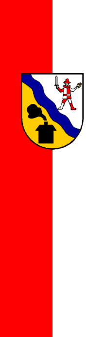 | Description of arms (German): | Ein Schild, schräg geteilt von einem doppelten Wellenband in Blau, darüber im linken Feld in Silber ein Mann mit rot-silber verwechselten Kleidern, rechts ein Schwert, links einen goldenen Ring mit Rubin haltend, darunter im rechten Feld in Gold ein Blahhaus in Schwarz. [1] |