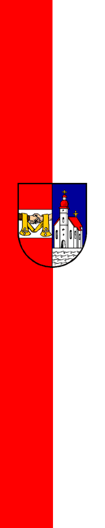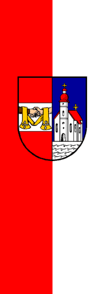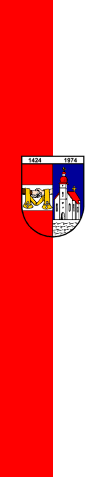 | Description of arms (German): | In gespaltenem Schild rechts in Rot ein silberner Balken, worin zwei aus den Feldrändern wachsende Unterarme, mit einer goldenen Stola umwunden, einander die Hände reichen. Der rechte Arm braun bekleidet (Mann), der linke nackt (Frau). Links in Blau über naturfärbigem Wellenschildfuß auf silbernem Boden eine silberne Kirche mit roten Dächern. Außerhalb, über dem oberen Schildrand nebeneinander die schwarzen Jahreszahlen 1424 und 1974. [1] [2] |
