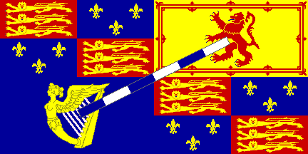 Quarterly: 1st and 4th, France & England quarterly, 2nd Scotland, 3rd Ireland: the whole debruised by a baton sinister, compony of six pieces, argent and azure.