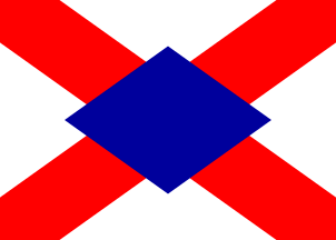 White flag with red saltire, a blue lozenge placed over it in the centre. Jorge’s version has the lozenge large, the BI site small. Lloyd's Flags and Funnels [ll012] shows it large again, bolstering up Jorge’s version.