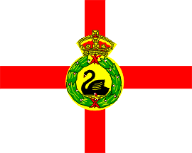 The house flag of State Shipping, West Australia. A rectangular white flag with a red cross. In the centre, there is a yellow disc with a black swan within a laurel wreath and a crown above it. The flag is made of a wool and synthetic fibre bunting. It has a cotton hoist and is machine sewn with the design printed. A rope is attached.Jarig Bakker, 30 Aug 2004