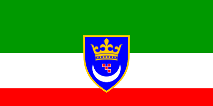 The flag is tricolour of green over white over red with relative widths 1:2:1, that is, the width of the middle white stripe is double of the width of each of the green and red stripes, with the coat of arms set in the middle, as high as the white stripe, that is, just touching the green and red stripes.