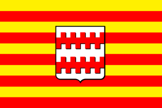 yellow and red, with a coat of arms "Argent two fesses crenelled and
