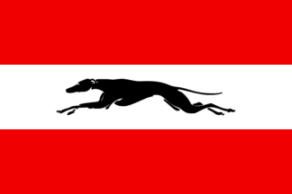 A photo, taken on 12 July 2009, shows the flag with the dog slightly different from the image above. On the photo, the dog has the ear and tail pointing up, the penis visible, and a white collar with a ring.