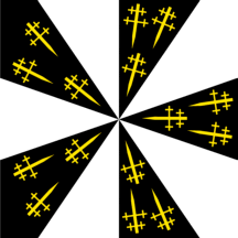 incorporation of Brabant to Hainaut. Hugues bore "Argent and sable of ten pieces ieronnez, moult richement eslevés et dedans chaque pièce de sable furent semées croisettes d'or recroisetées (gyronny in each piece sable a "semy" of crosses crosslet