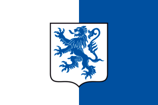 Parti blanc et bleu chargé au centre de l'écu communal occupant le tiers du battant.