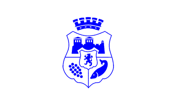 The flag is the municipal shield in blue on a white field. The shield is party per fess, with a silhouette of a castle on the upper part, the lower half party per pale, with a bunch of grapes in the dexter field and a swimming fish in the sinister field. Centred inescutcheon is a small shield with a lion rampant. The whole is surmounted by a mural crown.