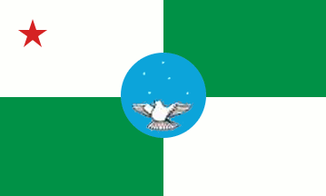 Quartered white and green flag, with a centred blue disk showing the Southern Cross and a rising dove; in the upper hoist a small red star.